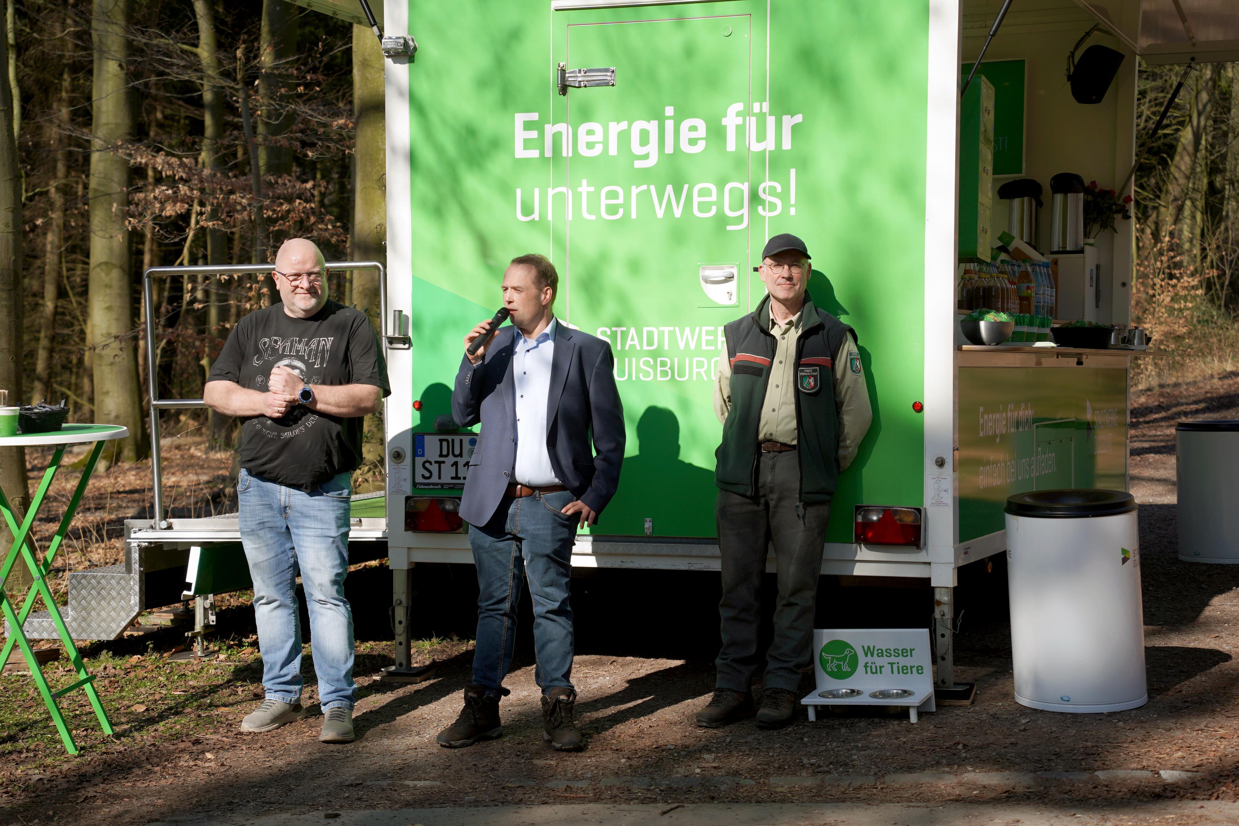 Bei frühlingshaftem Wetter begrüßten Axel Prasch, Vorstand der Stadtwerke Duisburg AG, Christian Theves, Abteilungsleiter Privatkundenvertrieb der Stadtwerke Duisburg AG, und Stadtförster Stefan Jeschke die zahlreich erschienenen Duisburgerinnen und Duisburger, die die Veranstaltung zu einem wahren Familienfest mitten im Wald machten. „Wir freuen uns, dass in diesem Jahr wieder so viele Familien unserem Aufruf gefolgt sind, gemeinsam etwas für den Klimaschutz in Duisburg zu tun“, sagte Prasch zum Auftakt der Veranstaltung. Von 11 bis 15 Uhr hatten die angemeldeten Stadtwerke-Kundinnen und -Kunden die Möglichkeit, auf einem Areal im Duisburger Stadtwald ihren Baum zu pflanzen. Ein engagiertes Team der Stadtwerke organisierte die Anmeldung und versorgte die Pflanzenden an der Stadtwerke-Energielounge mit Getränken sowie Bratwürsten vom Grill. Kinder konnten sich Stockbrot an einer Feuerschale backen und zum Weltfrauentag hielten die Stadtwerke Rosen als Überraschung parat.