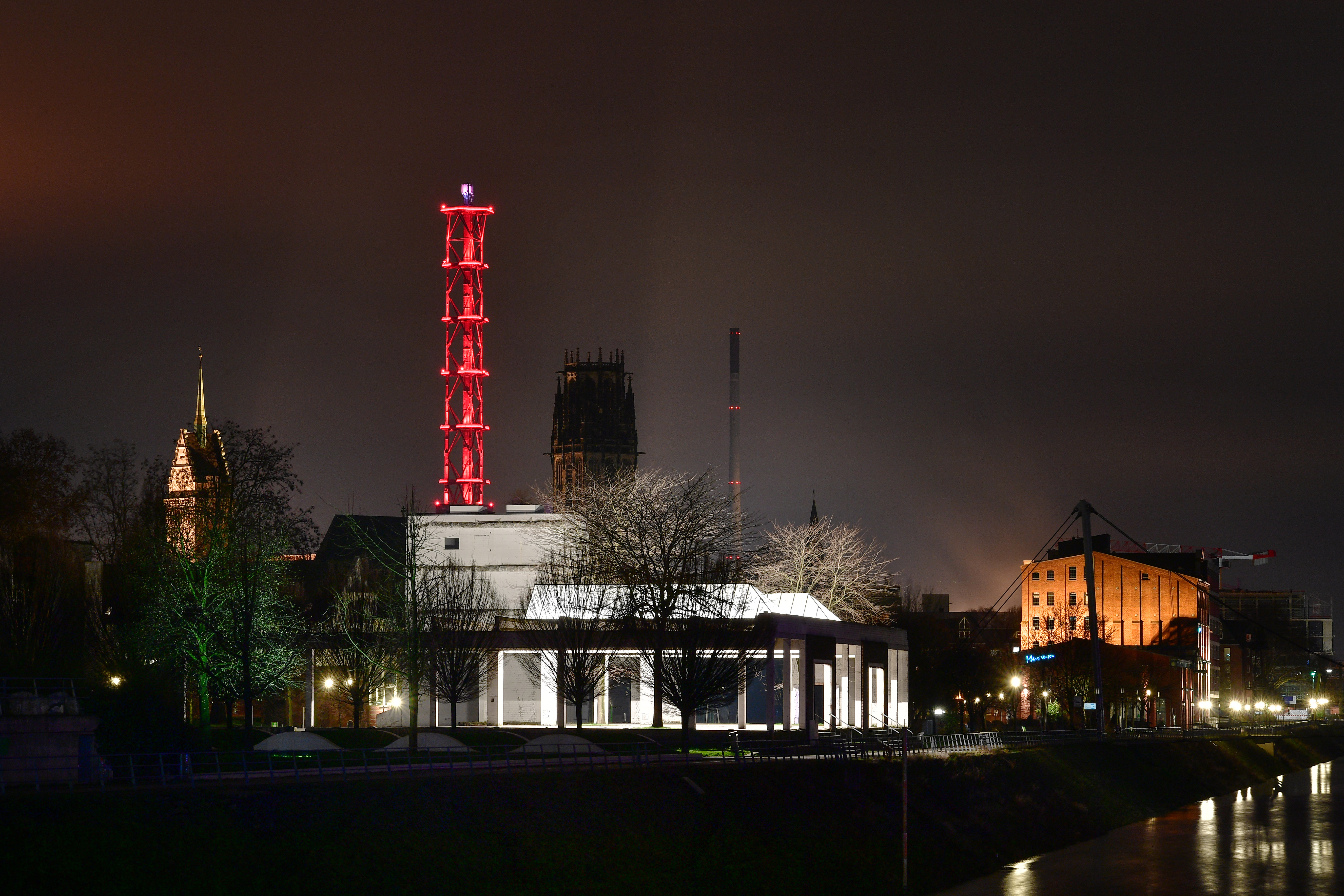 Rot angestrahlt mit einer weißen Spitze grüßt der Stadtwerketurm als größte Weihnachtskerze der Stadt weithin sichtbar zum Fest der Liebe. Mit Einbruch der Dunkelheit erstrahlt die bekannte Duisburger Landmarke Heiligabend in feierlichem Rot. Diese besondere Attraktion ist auch in den folgenden beiden Nächten des 1. und 2. Weihnachtstages noch zu bestaunen.