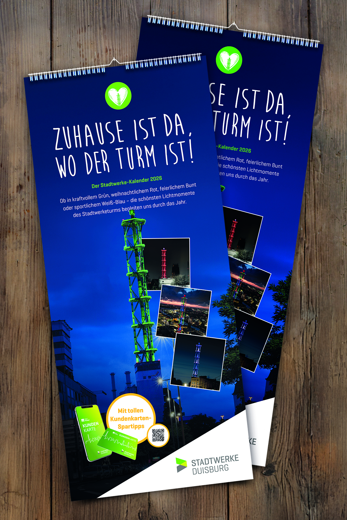 Die stimmungsvollen Turm-Motive stecken voller Symbolkraft und Energie. Der Stadtwerke-Kalender enthält die aktuellen Termine für das kommende Jahr und jeden Monat wartet ein tolles Kundenkarten-Angebot mit exklusiven Rabatten und Freizeitaktionen. Der Familien-Wandkalender 2026 ist kostenlos und kann ab heute im DVG-Kundencenter am Hauptbahnhof abgeholt werden. Außerdem hat der Stadtwerke-Weihnachtsmann den Kalender im Gepäck. Er ist mit seinen Stadtwerke-Wichteln am 5., 13. und 20. Dezember jeweils von 14 bis 20 Uhr auf dem Duisburger Weihnachtsmarkt unterwegs.