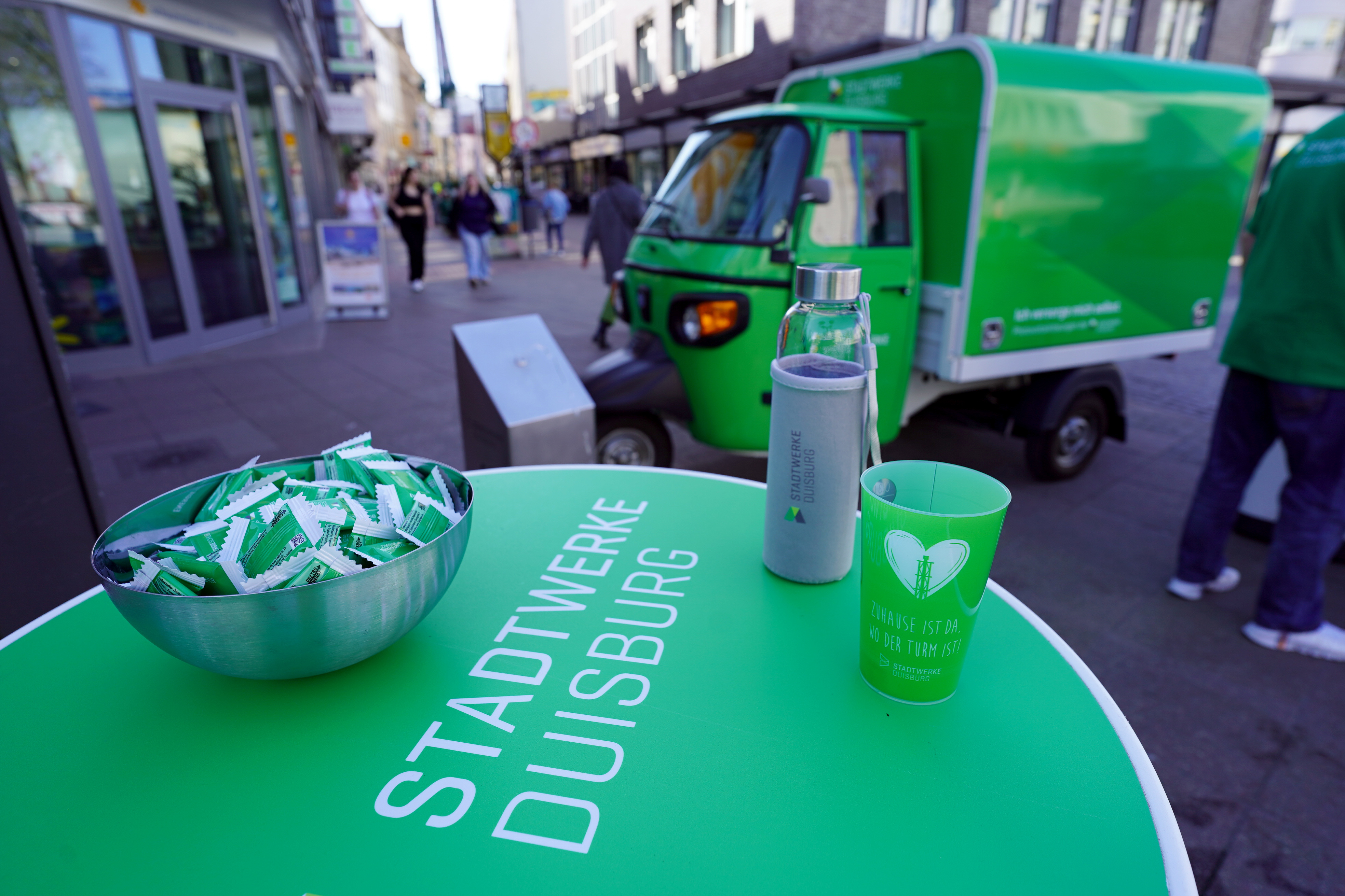 Für die Besucherinnen und Besucher in der City gab es zur Wiedereröffnung der Brunnen nicht nur frisches Trinkwasser in Lebensmittelqualität, sondern dazu noch ein kleines Geschenk: Mit der Glas-Trinkflasche der Stadtwerke Duisburg können sie sich ab sofort ihre Erfrischung für unterwegs nachhaltig abfüllen. Und natürlich gab es für alle, denen Wasser pur zu langweilig ist, noch kleine Geschmacksauffrischer und dazu jede Menge Informationsmaterial rund ums Thema Wasser.
