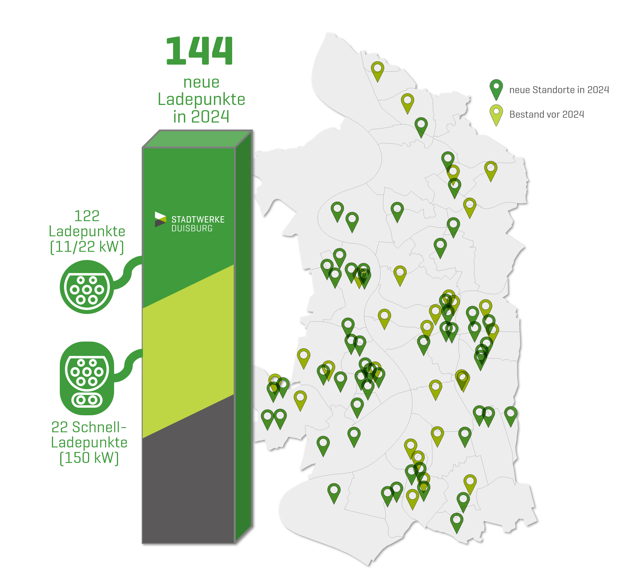 Duisburg will klimaneutral werden und um dieses ehrgeizige Ziel zu erreichen, bringen Stadtwerke Duisburg und die Stadt gemeinsam zahlreiche Projekte auf den Weg, die Emissionen deutlich reduzieren. Dazu gehört auch der konsequente Ausbau von öffentlicher Ladeinfrastruktur für Elektroautos, um allen Menschen in Duisburg die Gelegenheit zu geben, ihr Elektroauto schnell und unkompliziert zu laden und Mobilität damit klimafreundlich zu gestalten. Im Jahr 2024 haben die Stadtwerke Duisburg 144 neue Ladepunkte an 59 Standorten in Betrieb genommen – mehr in einem Jahr als je zuvor.