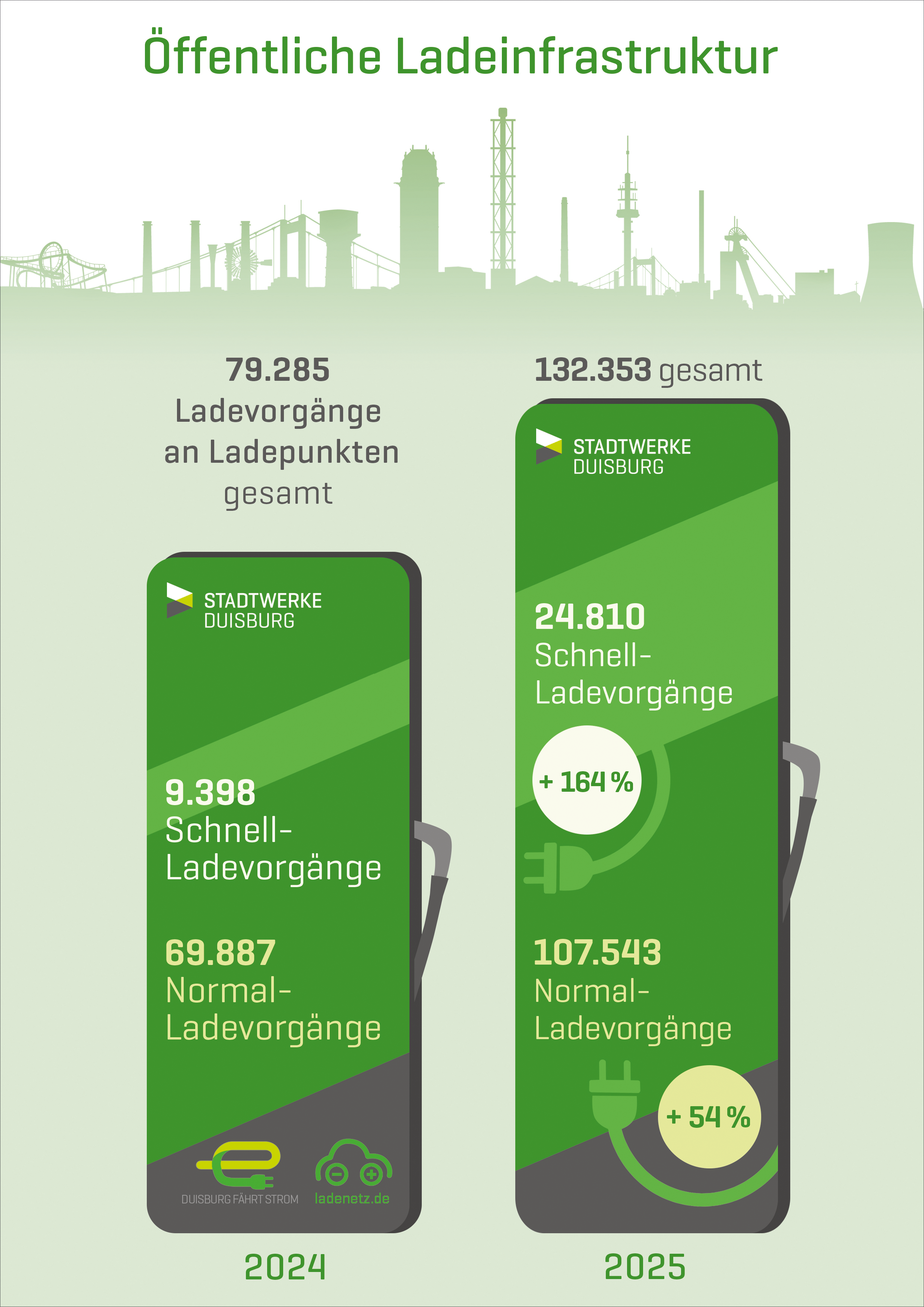 Duisburg will klimaneutral werden und um dieses ehrgeizige Ziel zu erreichen, bringen Stadtwerke Duisburg und die Stadt gemeinsam zahlreiche Projekte auf den Weg, die Emissionen deutlich reduzieren. Dazu gehört auch der konsequente Ausbau von öffentlicher Ladeinfrastruktur für Elektroautos, um allen Menschen in Duisburg die Gelegenheit zu geben, ihr Elektroauto schnell und unkompliziert zu laden und Mobilität damit klimafreundlich zu gestalten. Im Jahr 2025 haben die Stadtwerke Duisburg 222 neue Ladepunkte an 90 Standorten in Betrieb genommen – mehr in einem Jahr als je zuvor.