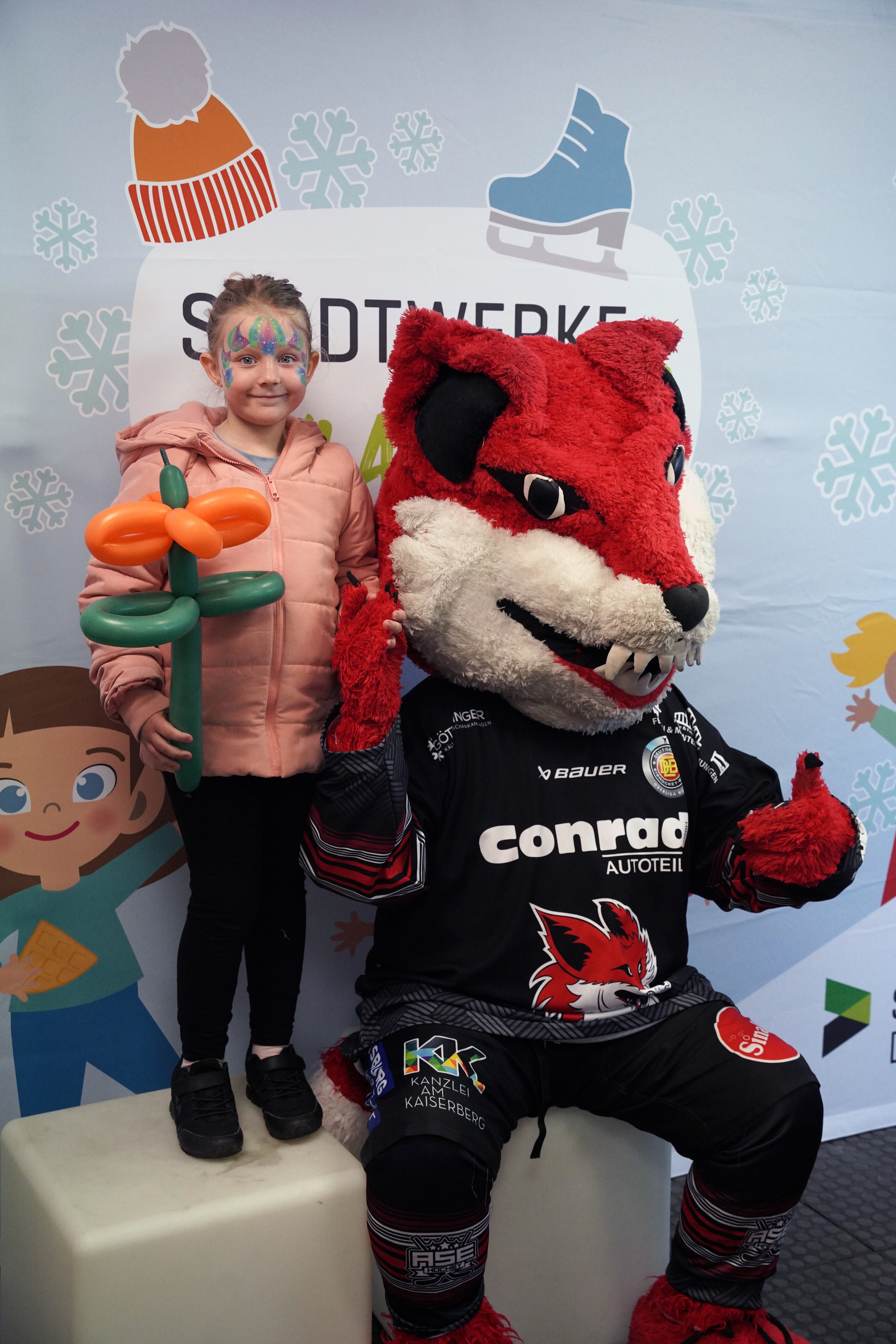 Volle sechs Stunden gab es auf dem Eis, drumherum und vor der Halle allerhand zu erleben und zu entdecken. Wer wollte, konnte nach Herzenslust auf der in drei Bereiche unterteilten Eisfläche seine Runden auf den Kufen drehen, sich mit dem Eishockey-Schläger versuchen oder mit dem Schlitten übers Eis sausen. Neben dem Eis konnten sich die kleinen Besucherinnen und Besucher beim Kinderschminken in fantastische Tierwesen verwandeln, sich auf der Hüpfburg austoben oder in der Fotobox tolle Erinnerungsfotos schießen. Natürlich waren auch die „Hausherren“ mit dabei und die Füchse-Spieler Adam Zoweil und Brooklyn Beckers schrieben fleißig Autogramme. Ebenfalls mit dabei war das Füchse-Maskottchen „Manni“, das jeden Fotowunsch erfüllte. Wem nach so viel Action der Magen knurrte, fand an den Verpflegungsständen die richtige Stärkung für die nächsten eisigen Highlights beim Stadtwerke-Eislaufspaß.