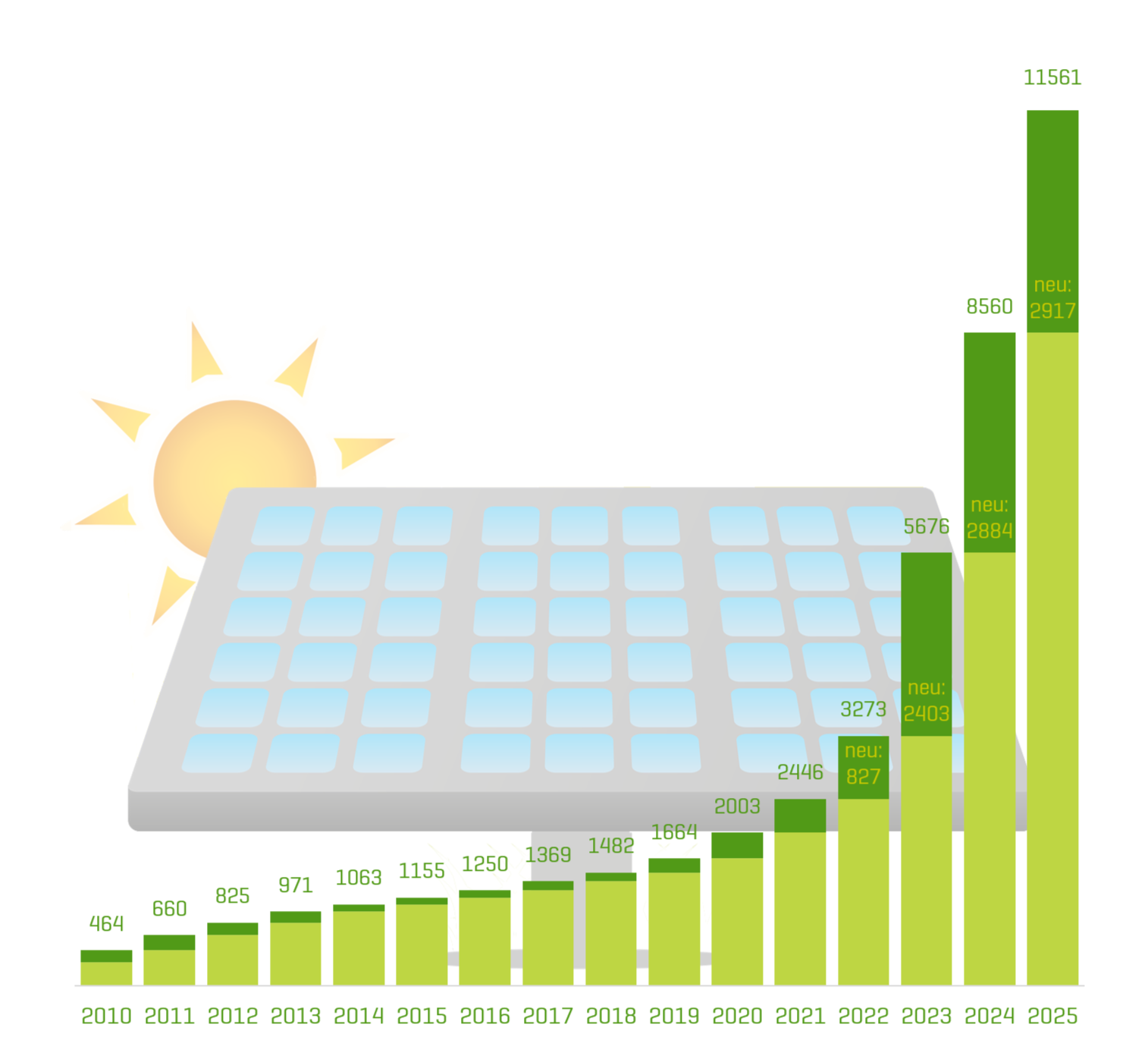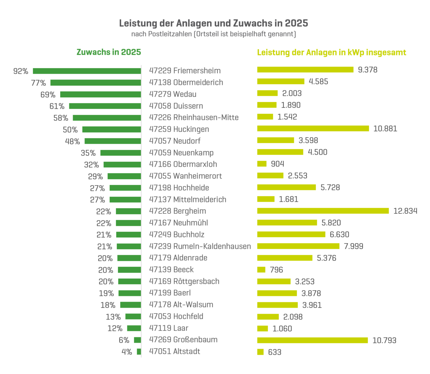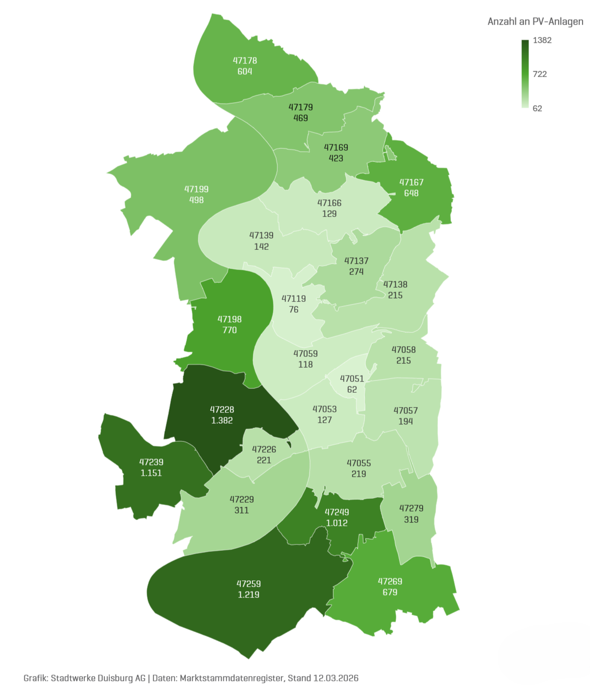 Der Solaratlas der Stadtwerke Duisburg betrachtet nicht nur die Entwicklung in der gesamten Stadt, sondern auch in den einzelnen Ortsteilen: 2025 verzeichnete der Postleitzahlenbereich von Wedau und Bissingheim einen Zuwachs bei den Anlagen von 55 Prozent. Dort sind nun 319 Anlagen in Betrieb. Enorm war auch der Zubau im Postleitzahlenbereich von Mittelmeiderich mit 54 Prozent, wo nun 274 Anlagen für ressourcenschonende Stromerzeugung sorgen. In allen Ortsteilen in Duisburg sind die Zuwachsraten auch im Jahr 2025 deutlich zweistellig und liegen mindestens bei 21 Prozent.