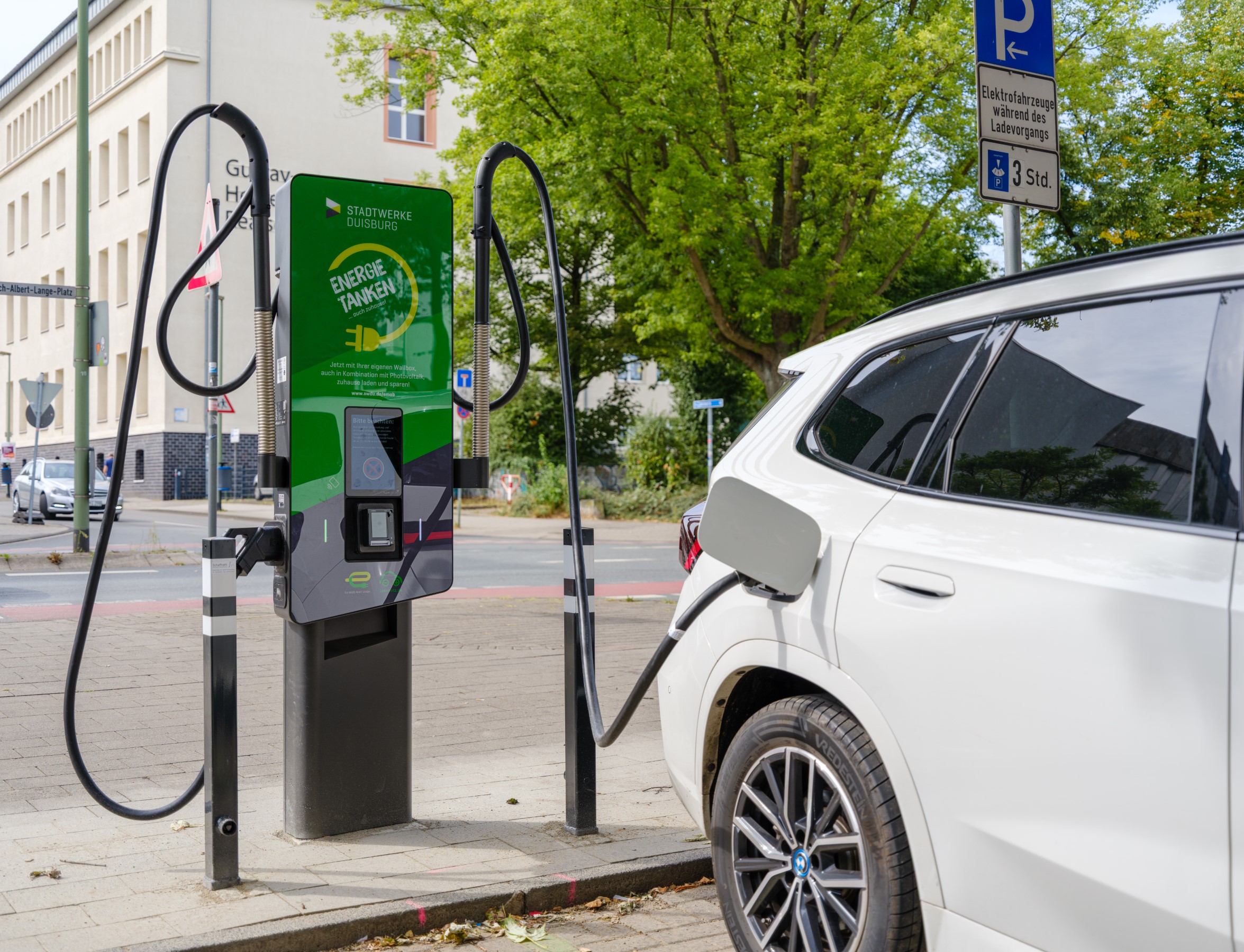 Jeweils zwei neue Ladepunkte stehen jetzt zur Verfügung an der Nombericherstraße in Untermeiderich auf Höhe der Hausnummer 3, an der Beguinenstraße in Bergheim auf Höhe der Hausnummer 126, an der Kreuzstraße in Walsum gegenüber der Hausnummer 4, in Alt-Walsum an der August-Thyssen-Straße auf Höhe der Hausnummer 65 und an der Goethestraße gegenüber der Hausnummer 55, in Fahrn an der Goerdelerstraße auf Höhe der Hausnummer 68 sowie an der Barbarastraße gegenüber der Hausnummer 15, an der Schweizer Straße in Neudorf-Nord auf Höhe der Hausnummer 105 und an der Musfeldstraße in Hochfeld auf Höhe der Hausnummer 113. Gleich vier neue Ladepunkte stehen ab sofort am Friedrich-Albert-Lange-Platz in der Altstadt gegenüber der Hausnummer 7 zur Verfügung. Zwei der Ladepunkte dort sind mit einer Schnellladefunktion mit 49 Kilowatt (kW) Ladeleistung ausgestattet.
